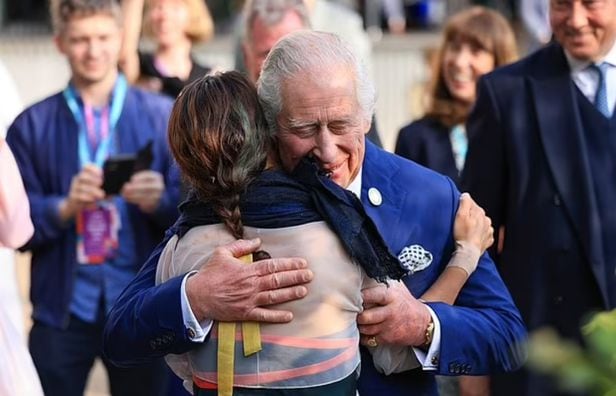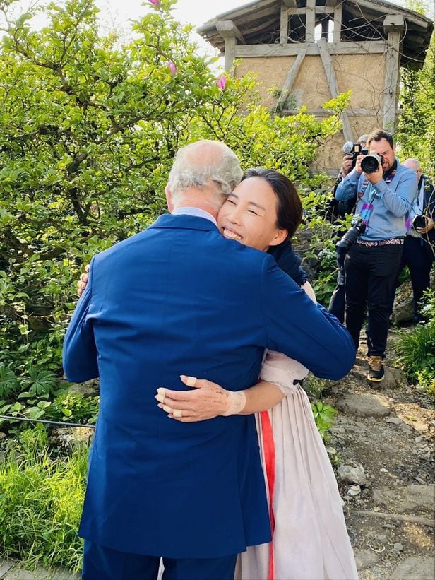 영국 찰스 3세 국왕이 22일(현지시각) 첼시 플라워쇼를 찾아 황지해 작가와 포옹하고 있다./황지해 작가