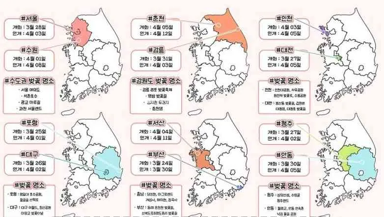 4월 3일부터 4월 10일까지 만개 예상되니 이번 주말에 아름다운 벚꽃 명소들을 방문해보세요. 봄의 따뜻한 햇살 아래, 화려하게 피어난 벚꽃을 감상하는 것만큼 로맨틱한 일이 또 있을까요? 🌸💕