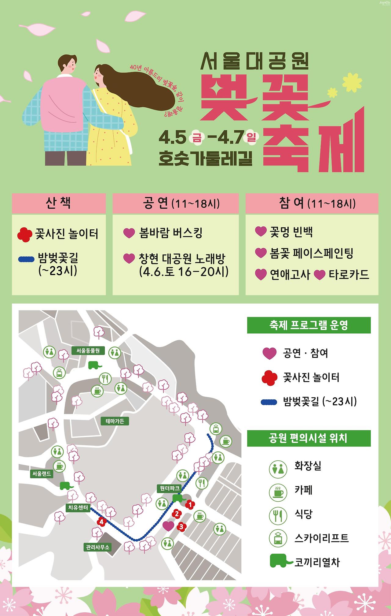서울대공원의 벚꽃길은 개원 40주년을 맞아 더욱 다양해진 프로그램으로 돌아왔습니다!