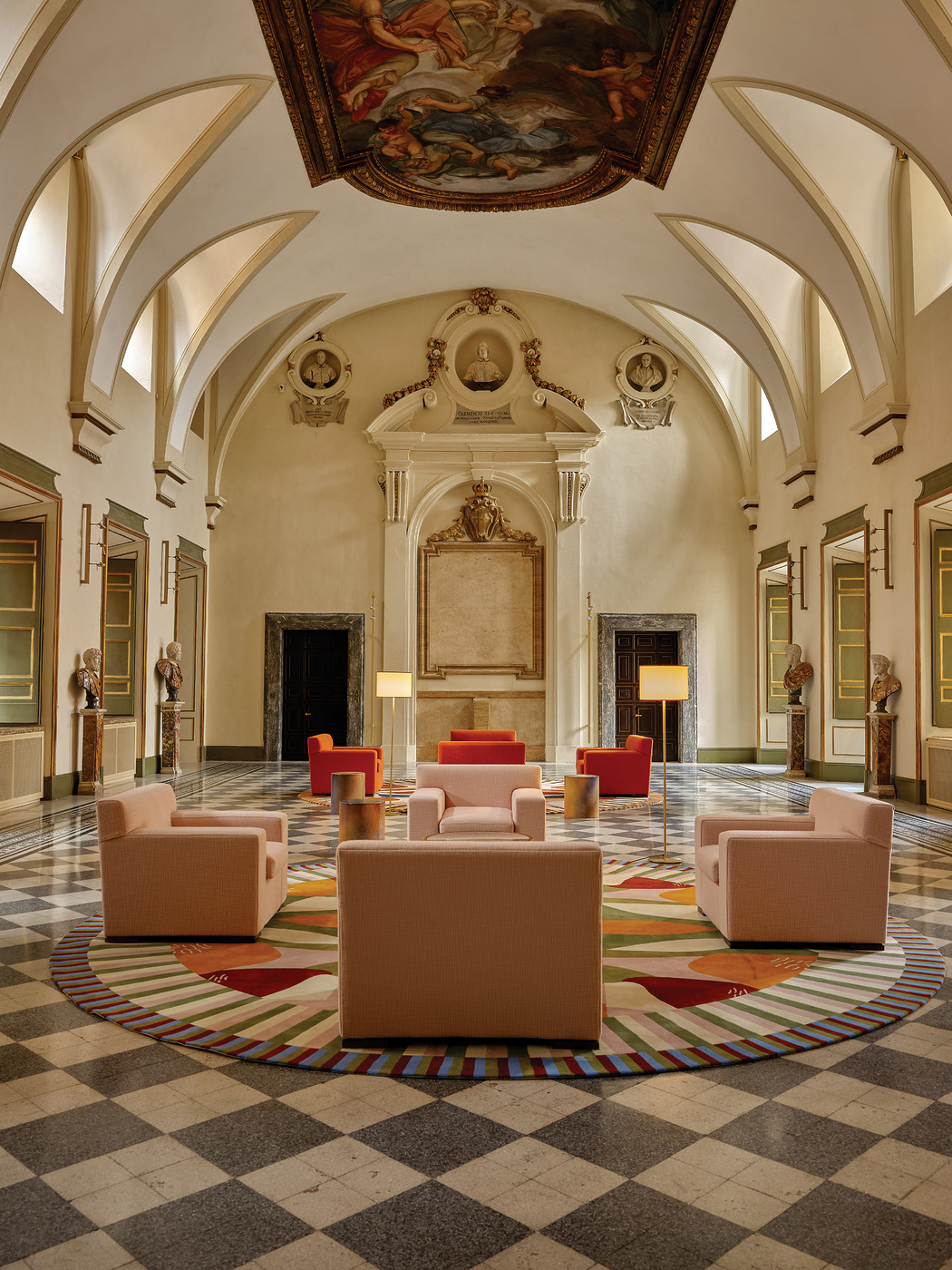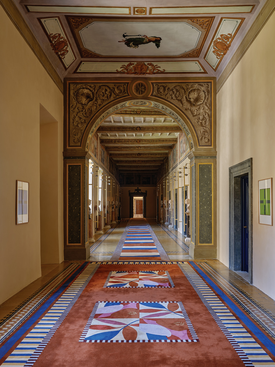 컬러풀한 카펫의 기하학 모티브는 복도의 오리지널 프레스코화, 처마 장식과 대조를 이룬다.