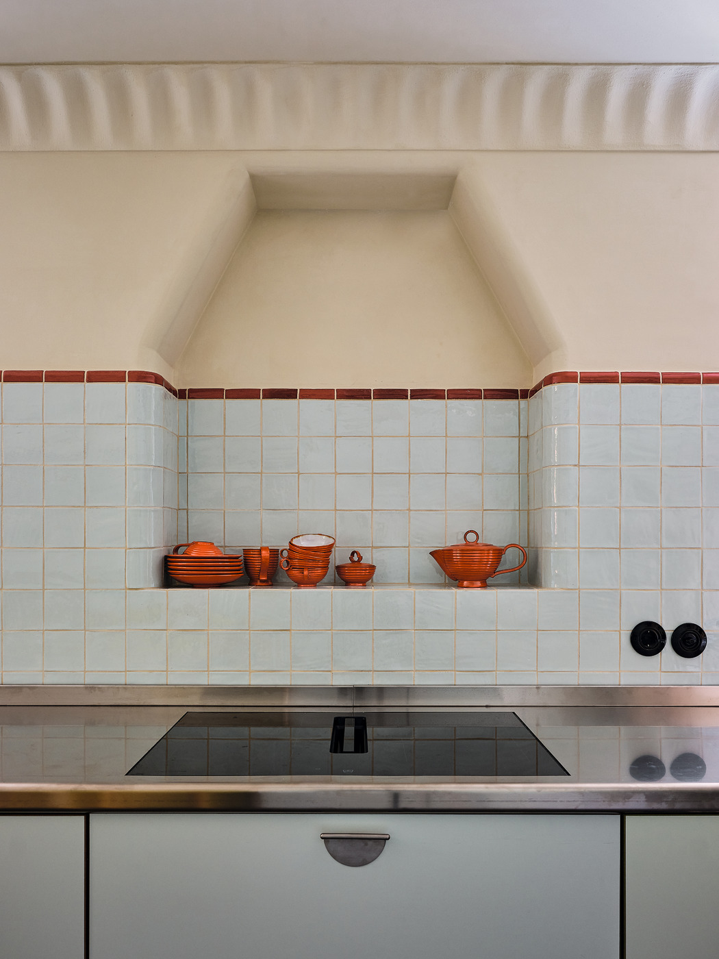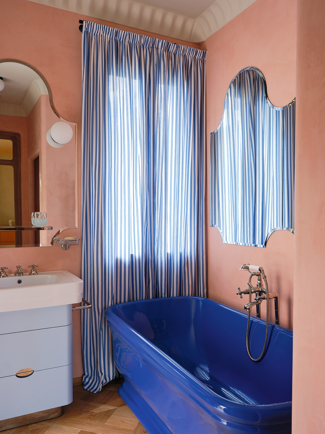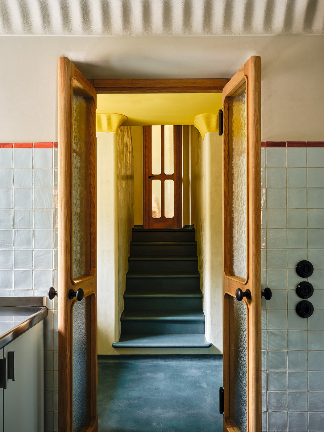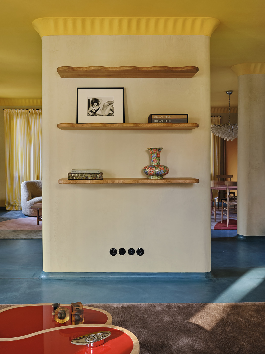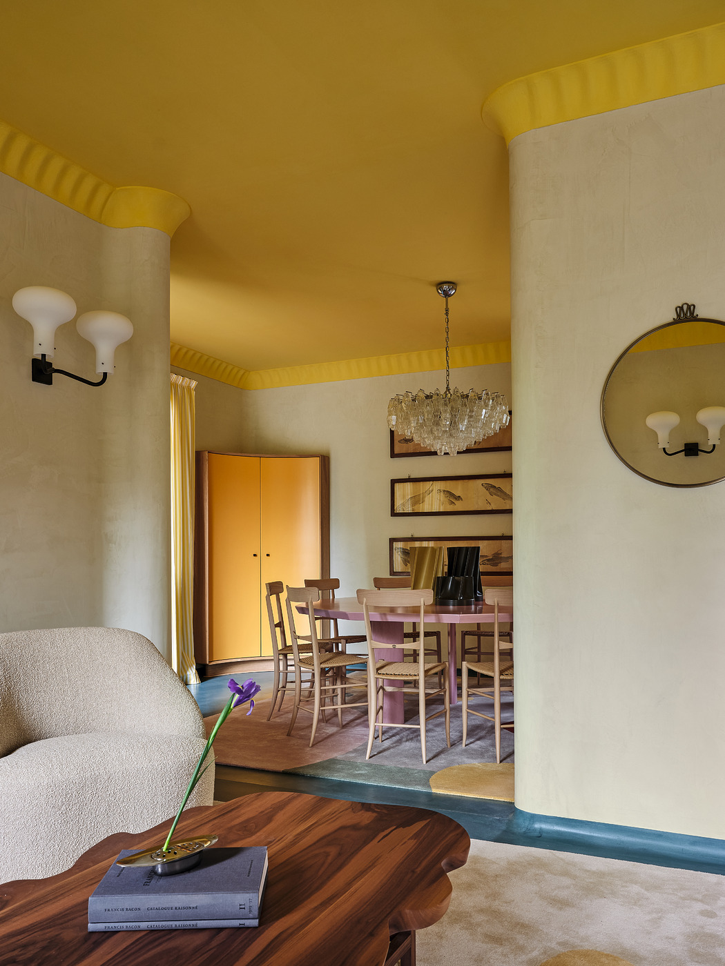 1층에 주방과 서비스 스위트, 중이층에는 응접실과 식당, 2층에 침실 2개가 있는 200㎡ 크기의 집은 1931년 지방의 귀족 부인을 위해 지은 것으로, 이후에 주인이 여러 차례 바뀌었다. 클라이언트가 매입했을 당시에는 비교적 상태가 좋은 편이었지만, 구아다니노는 “그 집의 건축 역사를 망라하는 여러 단계의 리노베이션을 거쳤으며 모든 것을 벗겨내야 했다”고 말한다. 그의 설명에 따르면, 그와 그의 팀은 코너와 벽 가장자리의 ‘곡선’, 파사드의 ‘꽃무늬 장식’을 유지했다. 그들은 가능한 한 현지 장인들의 노하우를 활용했다. 바닥과 벽에는 대리석 가루를 석고에 섞어 약간 매끄럽고 빛나게 만드는 베니스 마감 기법인 파스텔로네(Pastellone)를 이용했다. 갈로니는 “그것이 이 지역의 전형적인 건축 방식이자 로마 시대로 거슬러 올라가는 방법”이라고 말했다. 집에 유쾌한 분위기를 더하기 위해 그들은 바다색, 살구, 미나리아재비, 버터크림 빛깔의 노란색으로 구성된 활기찬 팔레트를 선택했다.
