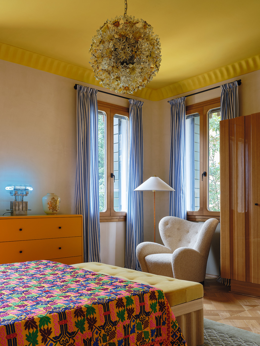 가구는 무라노 유리로 만든 샹들리에, 18세기 베니스 거울, 곡선 소파와 식탁 의자 등 집주인의 컬렉션에서 팀이 몇 가지를 골랐다. 스튜디오는 난간, 문손잡이, 욕실 거울과 창문뿐 아니라 그 밖의 나머지를 디자인했고, 모두 아르누보의 관능적인 곡선에 맞춰 만들었다. 날렵한 사각 주름이 잡힌 커튼은 역사적인 롬바르디아 방직공 제자 브론치니(Gegia Bronzini)가 손수 제작한 것이다. 카펫 디자인은 구아다니노가 직접 했는데, 그의 설명에 따르면 그것은 “곡선과 기이한 형태, 색을 조합해 실용적으로 만드는 방법”에 대한 연습이었다.