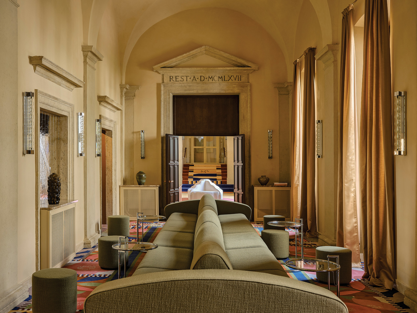 소파와 의자를 포함한 가구 대부분은 맞춤 제작이다. (심지어 구아다니노 스튜디오는 안뜰 정원을 볼 수 있는 독특한 유리 엘리베이터도 디자인했다.) 일부 제품은 폰타나아르테(FontanaArte), 데다르(Dedar)와 협업했으며, 다른 제품은 호텔을 위해 모은 수집품이다. 예를 들면 입구에 걸린 나폴레오네 마르티누치(Napoleone Martinuzzi)가 1940년대에 무라노 유리로 제작한 역사적인 샹들리에가 그렇다. 몰레춘이 회상했다. “마침내 샹들리에가 설치되자 사람들이 넋을 잃었죠.”